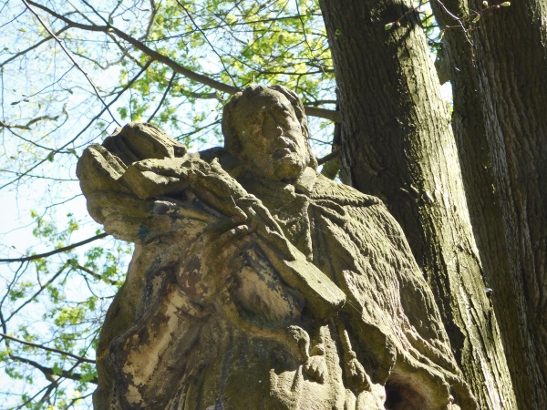 Święty na cokole stoi w kontrapoście i w przeciwieństwie do figury z mostu biretu nie ma umieszczonego na głowie, ale trzyma go w lewej ręce. Na cokole umieszczono godło cechu rzeźników, czyli głowę wołu ze skrzyżowanymi toporami oraz inicjałami (J.N.?).