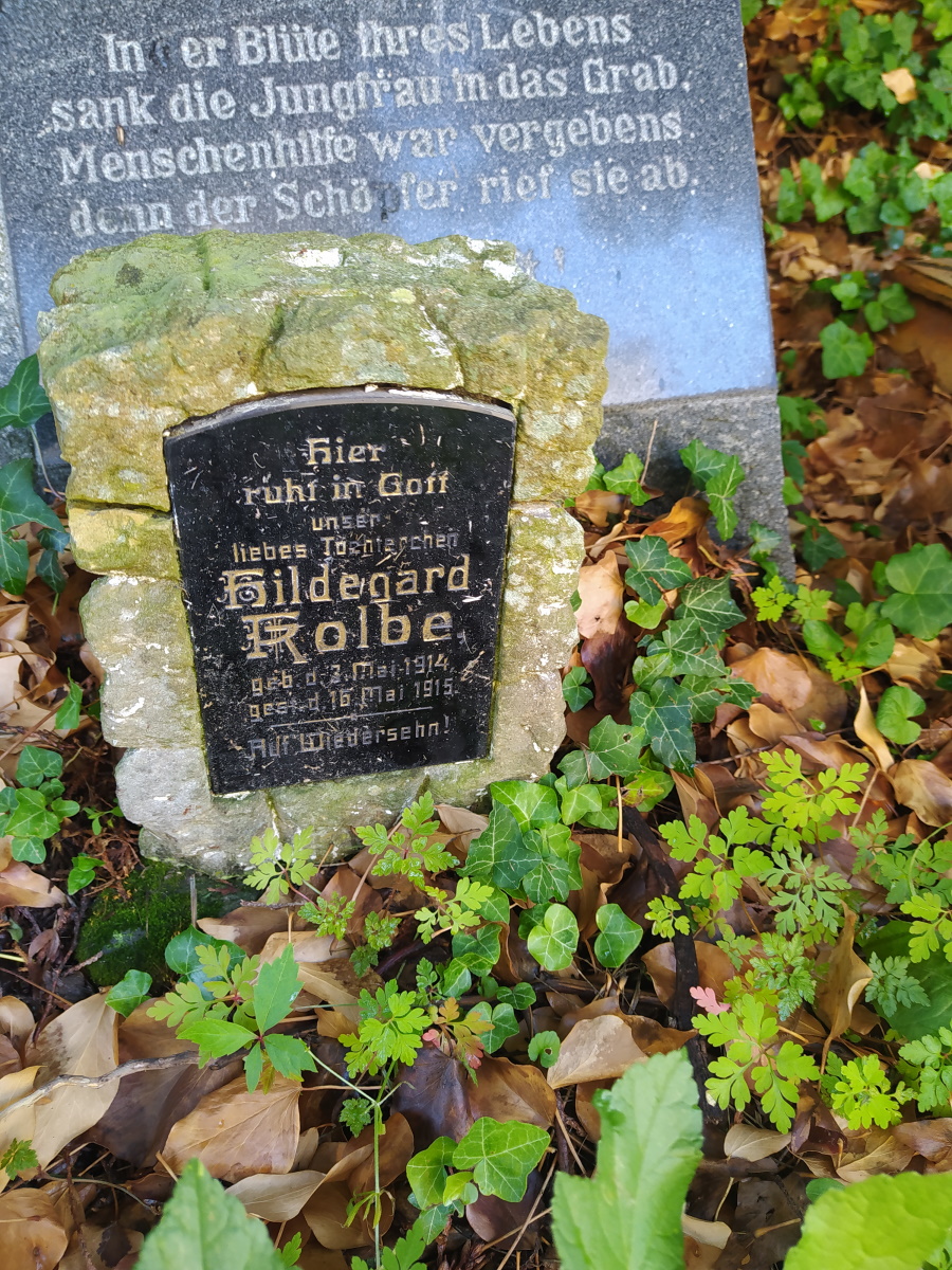 Kolbe Hildegard Published 7 sierpnia 2022 at 900 × 1200 in Cmentarz w Kątach Bystrzyckich ← Previous / Next → Hier ruht in Gott unser liebes Töchterchen Hildegard Kolbe, geb. d. 3. Mai 1914, gest. d. 16.Mai 1915 — Auf Wiedersehn!
