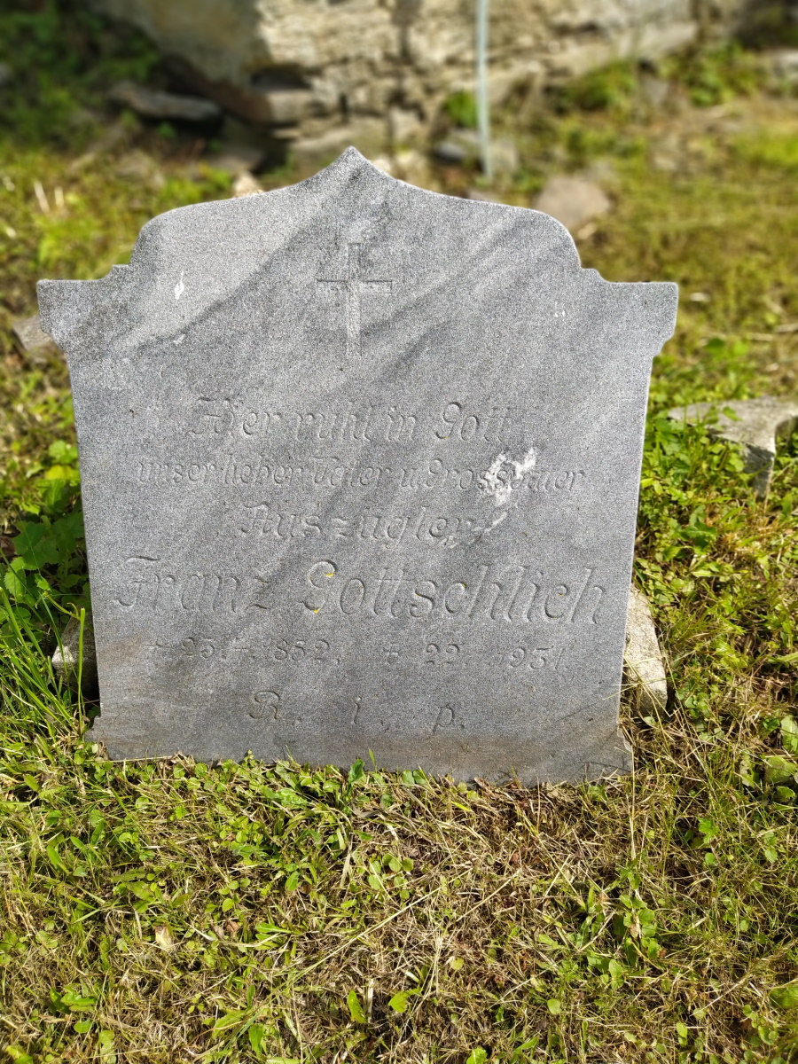 Gottschlich Franz Published 8 sierpnia 2022 at 900 × 1200 in Cmentarz w Kątach Bystrzyckich ← Previous / Next → Hier ruht in Gott unser lieber Vater u. Grossvater Auszügler Franz Gottschlich * 25.4.1852. + 22.1.1931. R.i.p.