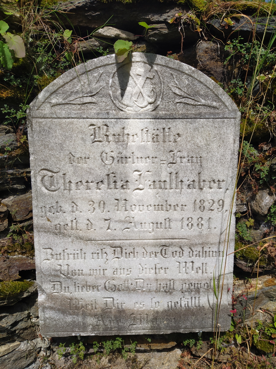 Faulhaber Theresia Published 9 sierpnia 2022 at 900 × 1200 in Cmentarz w Kątach Bystrzyckich ← Previous / Next → Ruhestätte der Gärtner=Frau Theresia Faulhaber, geb. d. 30. November 1829, gest. d. 7 August 1881. — Dufrüh riß Dich der Tod dahinn Von mir aus dieser Welt. Du, lieber Gott, Du hast gewolt. Weit Dir es so gefält. Ave Maria