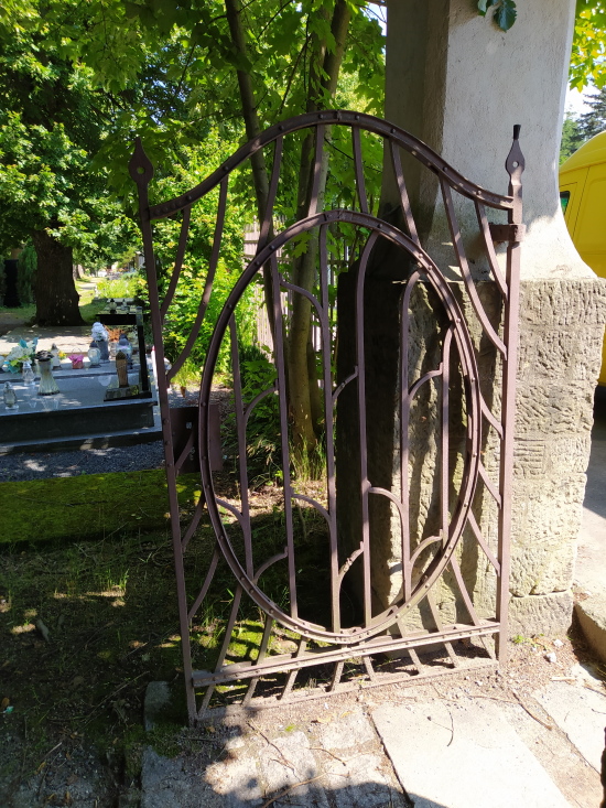 Brama zastępcza wstawiona w miejsce zaginionej. Obok oryginalna, żeliwna furta. Zdjęcie ze zbiorów Stowarzyszenia.