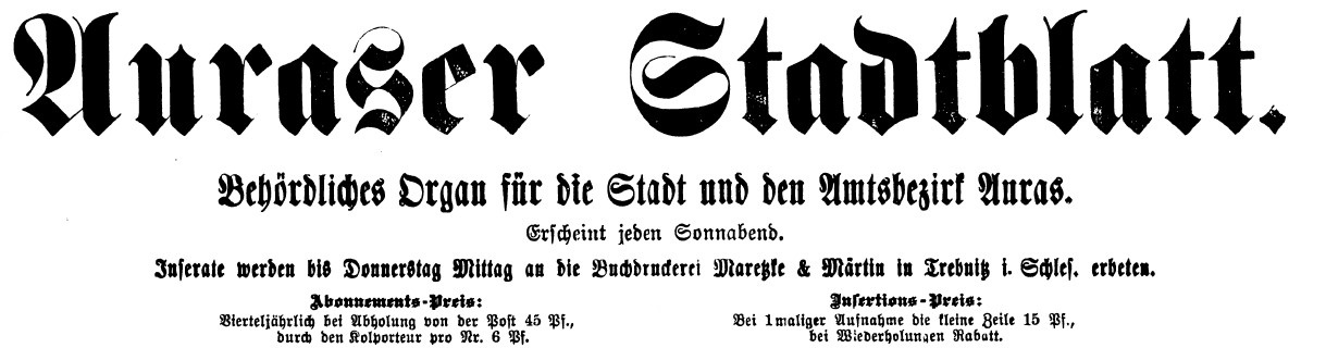 Źródło: Auraser Stadtblatt. Behördliches Organ für die Stadt und den Amtsbezirk Auras. 1911-08-19 [Jg. 6] Nr 33